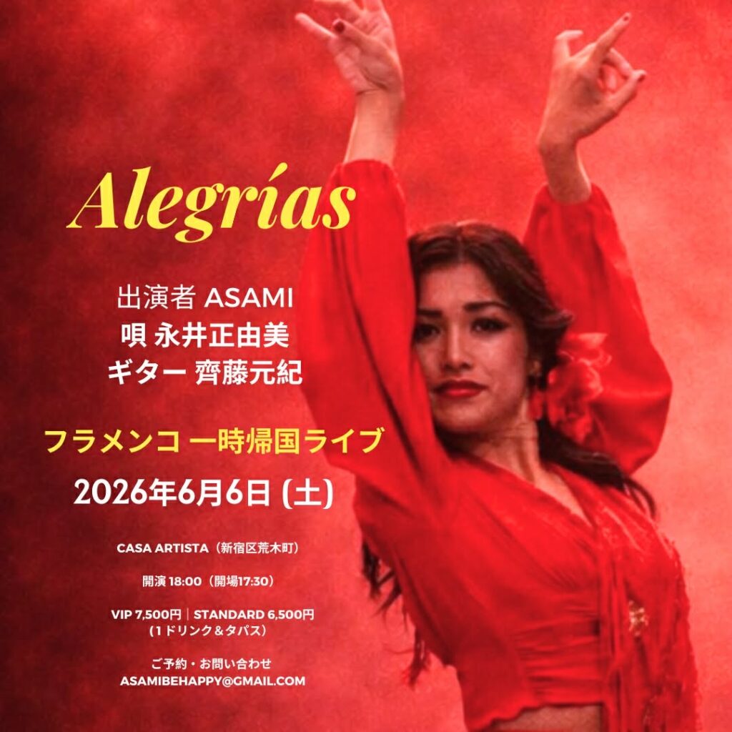 Alegrias-ASAMI フラメンコ一時帰国ライブ 2026年4月6日 最終更新日時 : 2026年4月6日 casa-artista 開催日: 2026年6月6日 5:30 PM - 10:00 PMカテゴリー: 貸切イベント