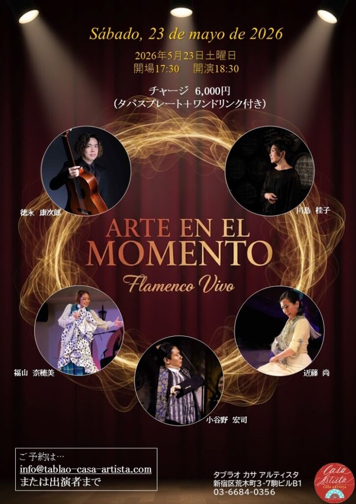 カサアルライブ 小谷野宏司企画『Arte en el Moment』 2026年3月4日 最終更新日時 : 2026年3月4日 casa-artista 開催日: 2026年5月23日 5:30 PM - 10:00 PMカテゴリー: 貸切イベント