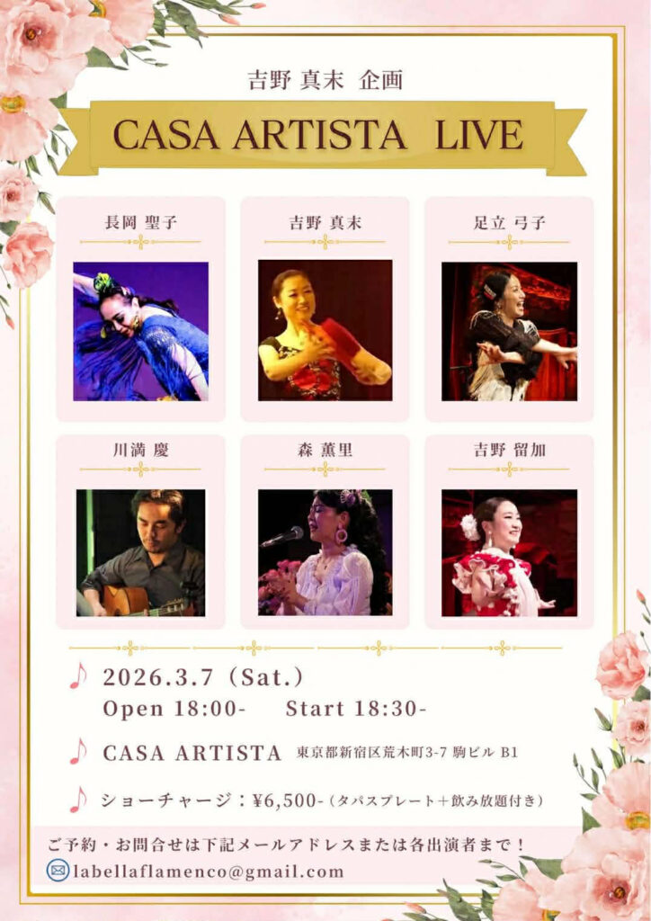 吉野真未企画 カサアルティスタライブ 2026年1月8日 最終更新日時 : 2026年1月8日 casa-artista 開催日: 2026年3月7日 6:00 PM - 10:00 PMカテゴリー: 貸切イベント ご予約はlabellaflamenco@gmail.comまたは出演者まで!
